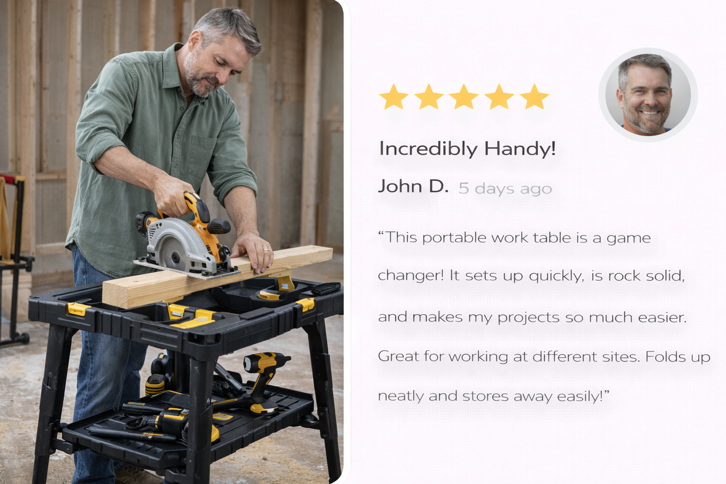 Many DIYers and contractors lose time—and accuracy—because they’re forced to work on wobbly temporary surfaces, with tools scattered everywhere, and not enough workspace in garages, driveways, or job sites. That leads to mistakes, rework, and even safety risks when cutting, drilling, or assembling.
