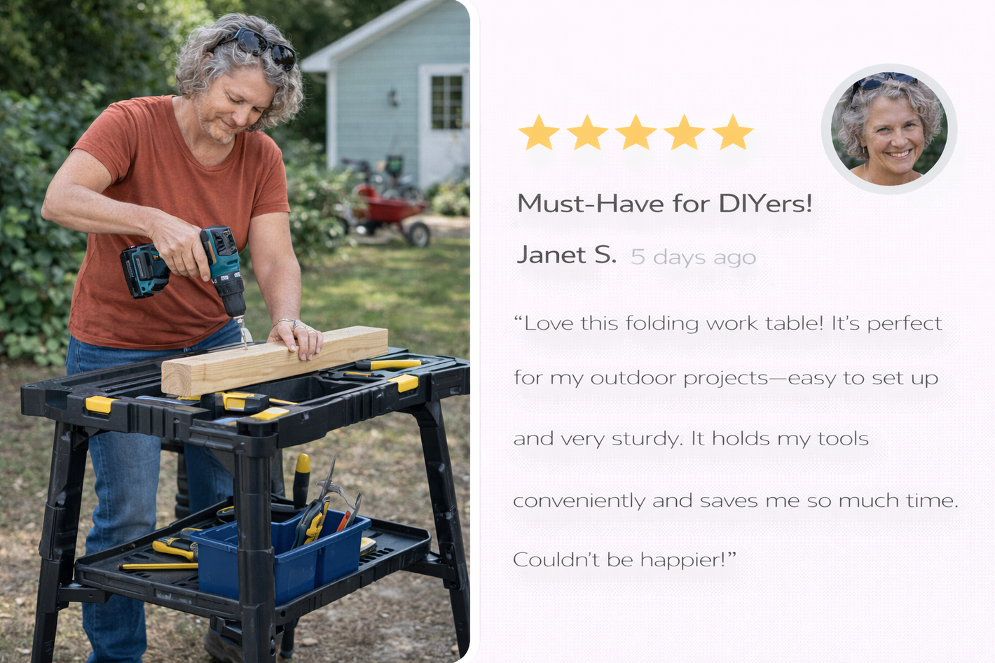 These are real Nivraus customers who used to struggle with unstable work surfaces, scattered tools, and limited workspace while handling repairs and DIY projects. After switching to the Nivraus Portable Folding Work Table & Tool Storage Stand, they can now set up a stable workstation anywhere, keep their tools organized and within reach, and complete projects faster,