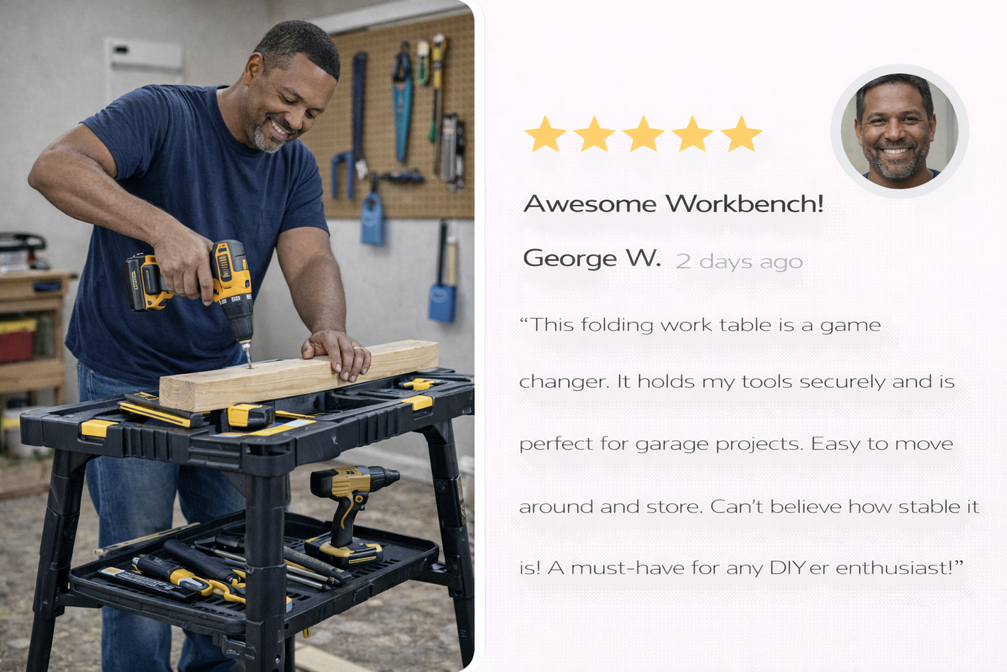 “Before getting the Nivraus Portable Folding Work Table, I was always working on unstable surfaces, and my tools were constantly scattered around, slowing down every project. After switching to this workbench, I can set up a solid workspace anywhere in seconds, keep my tools organized on the storage shelf, and move the table easily between the garage and jobsite. Now my projects are faster, safer, and much more efficient than before.”